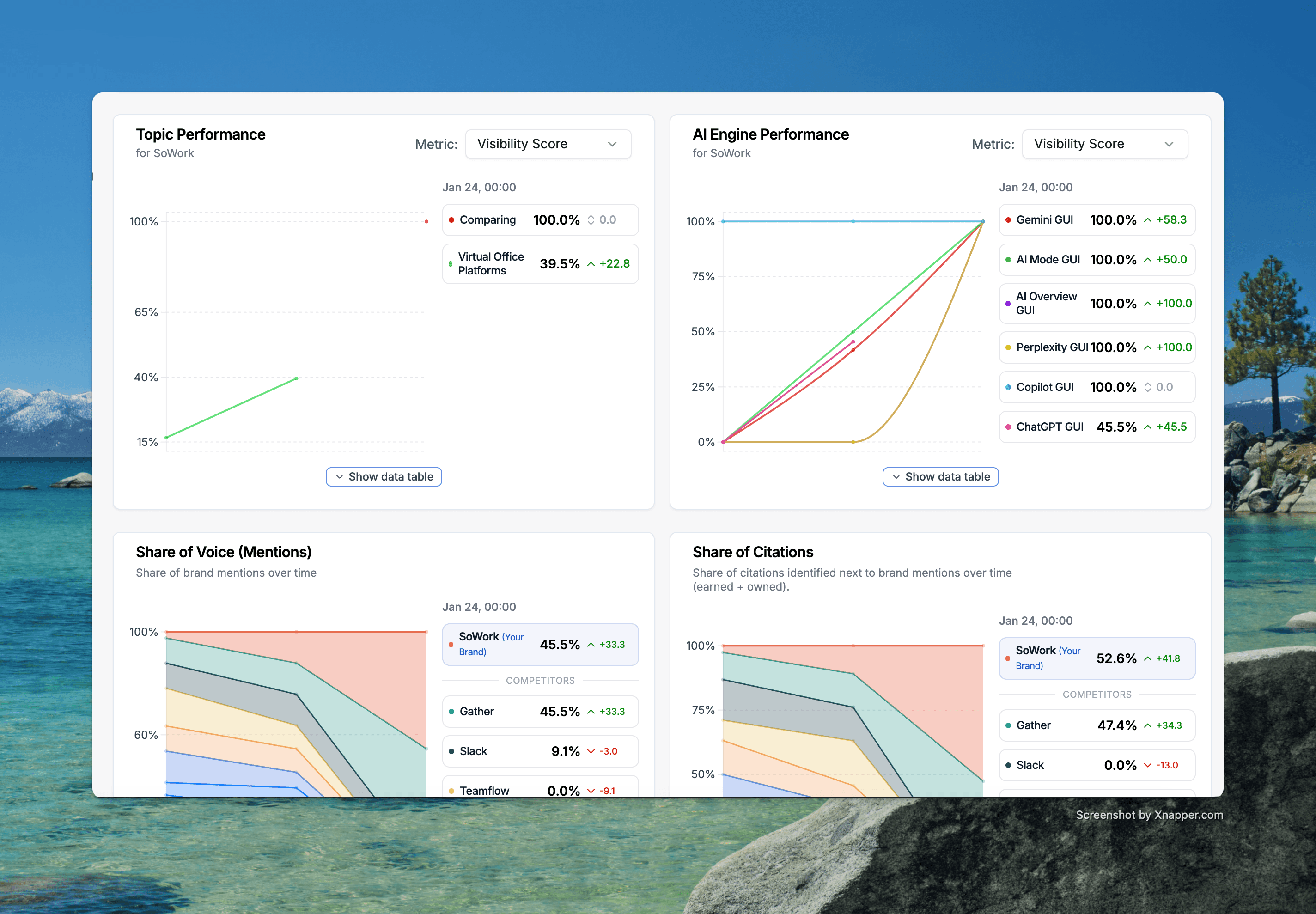 Share of Citations: 52,6 % mehr als jede zweite KI-Quellennennung in der Kategorie ging an SoWork. Share of Voice auf Augenhöhe mit Gather (45,5 %). SoWork war innerhalb von Tagen zur meistzitierten Alternative in der Kategorie geworden.